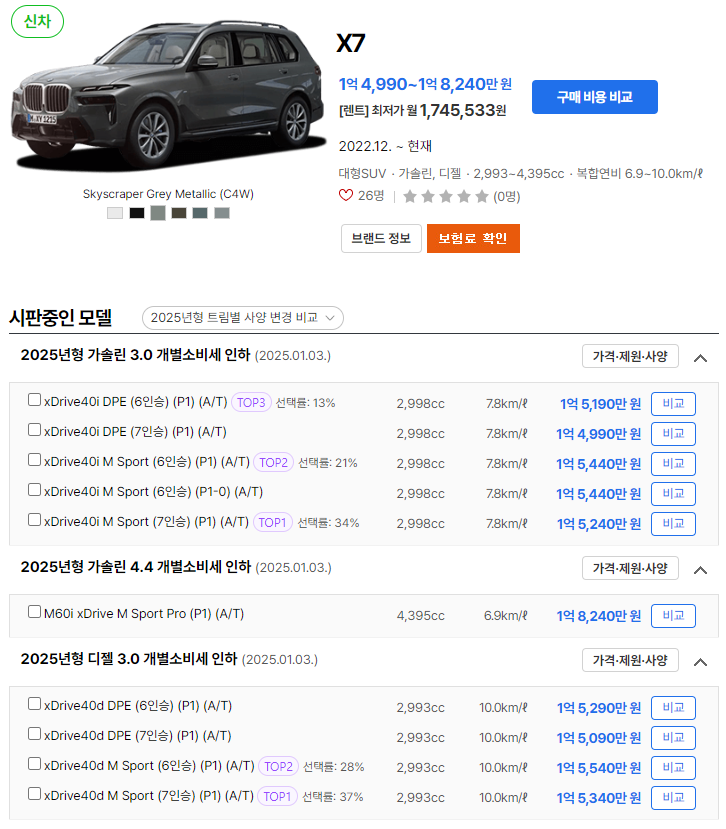 2025 BMW X7은 xDrive40i, xDrive40d, M60i 등 다양한 트림을 갖추고 있으며, 각 트림별로 다른 옵션이 제공됩니다. 개별 옵션을 추가함으로써 개인화된 차량을 경험할 수 있습니다.