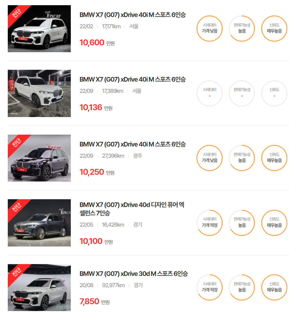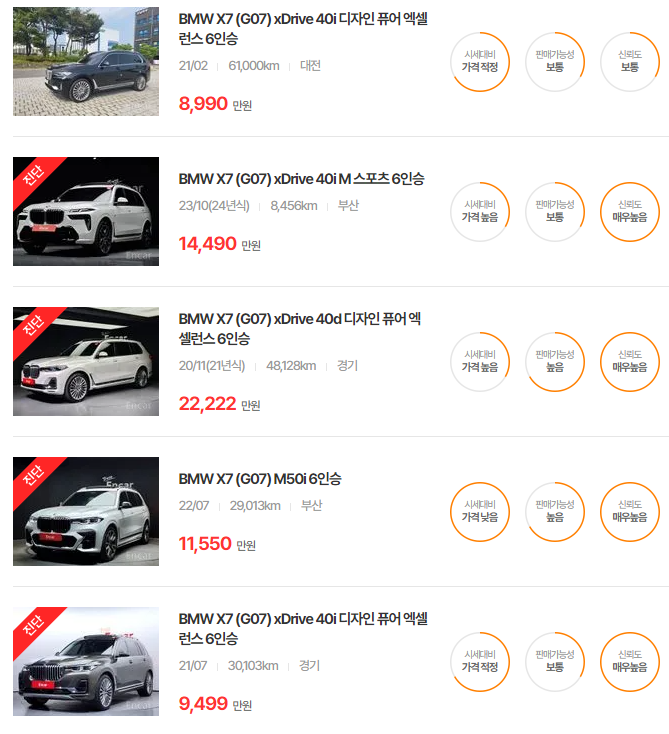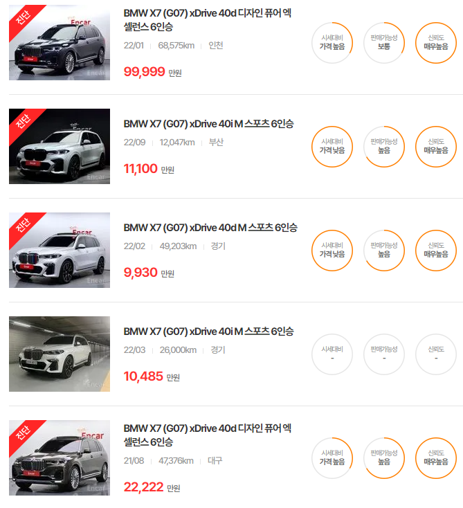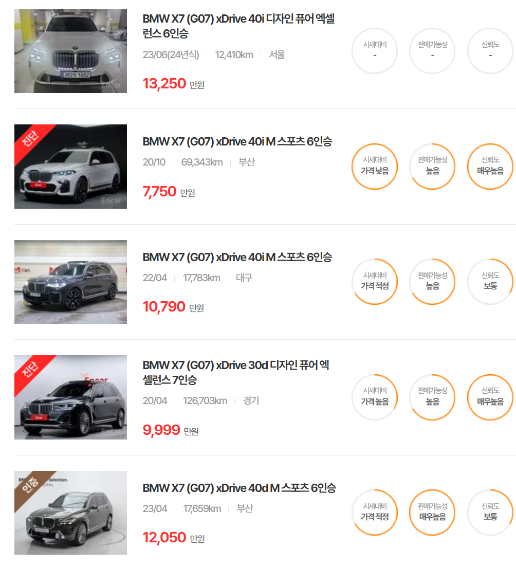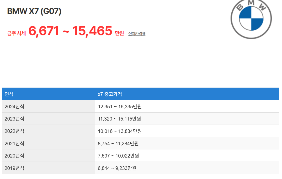중고차 구매 시 가격 정보는 가장 중요한 요소 중 하나입니다. 아래는 BMW X7의 연식별 중고차 가격 정보입니다.