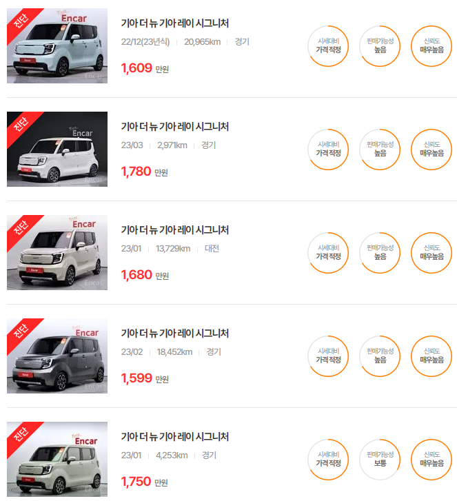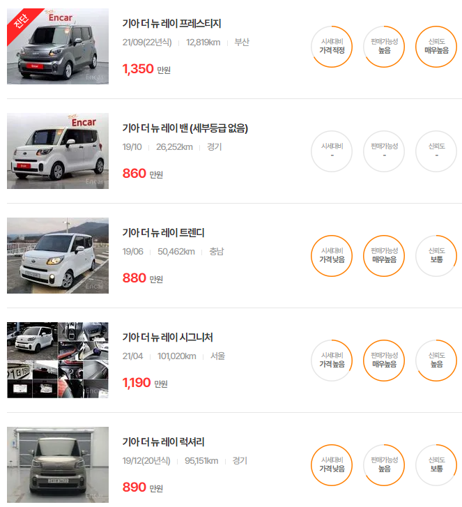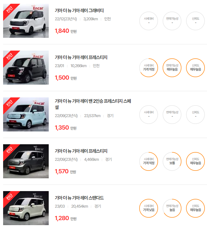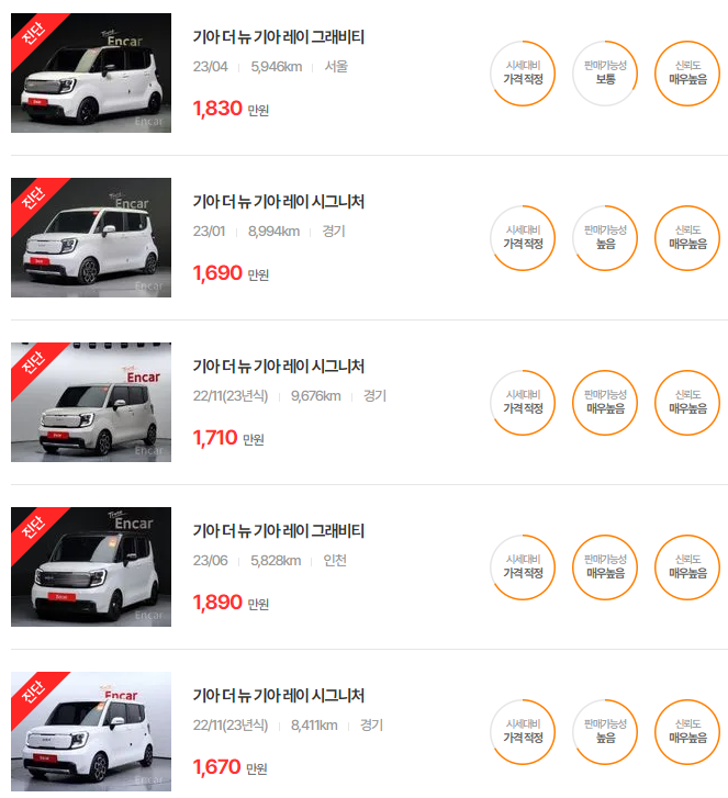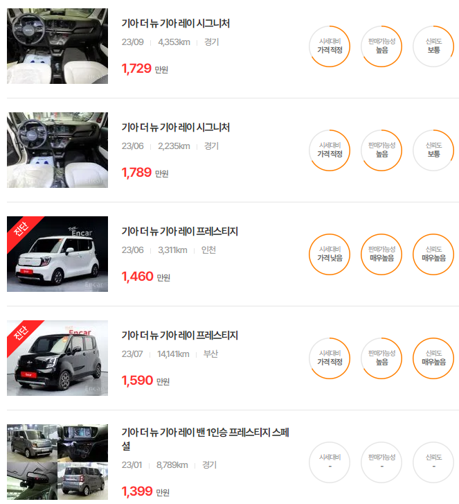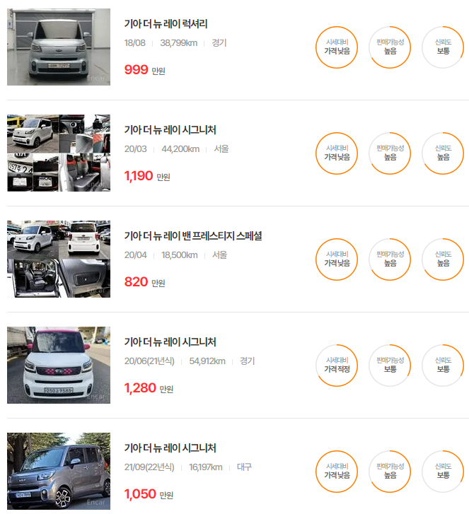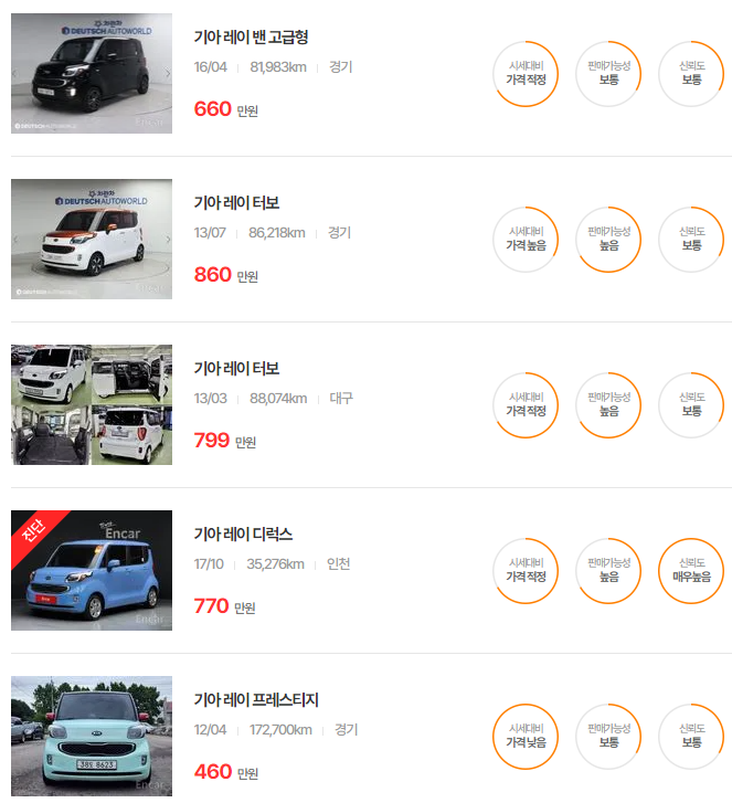 레이 중고차 가격 시세표