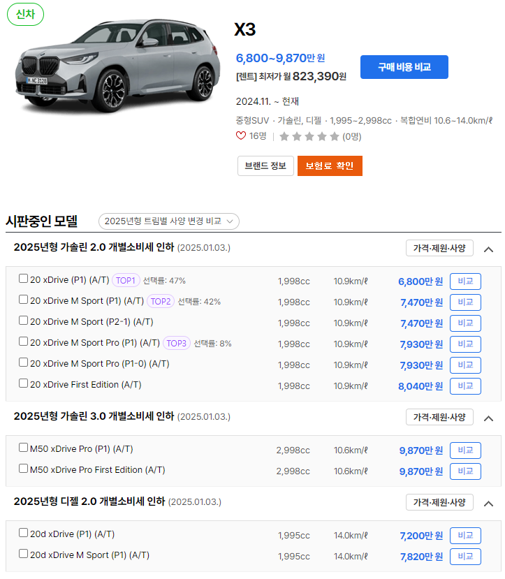 BMW X3는 다양한 트림 옵션을 제공하며, 소비자가 선택할 수 있는 다양한 가격대가 있습니다.