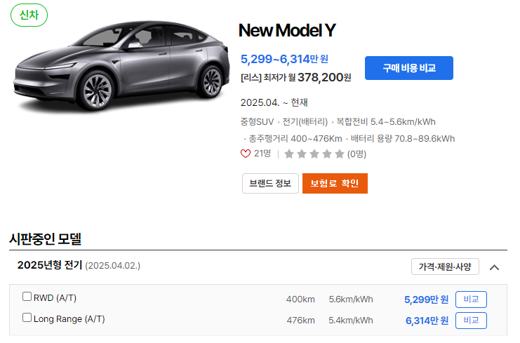 테슬라 모델Y 주니퍼의 가격은 RWD 모델 5,299만 원, Long Range 모델 6,314만 원입니다.